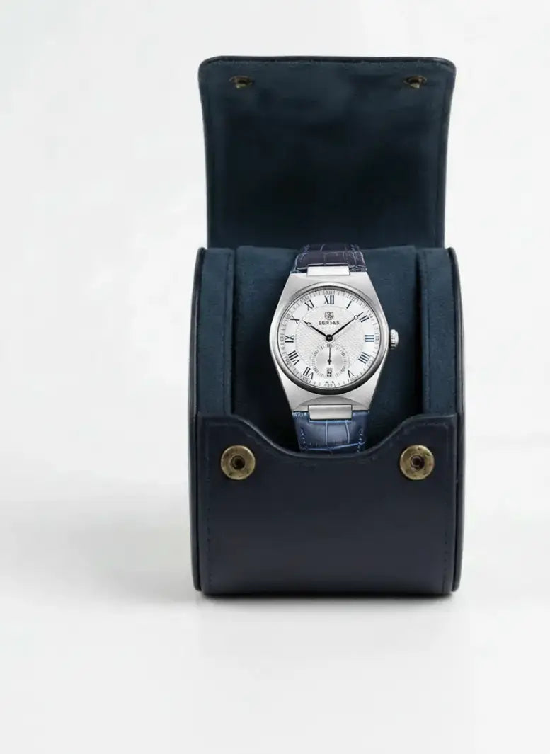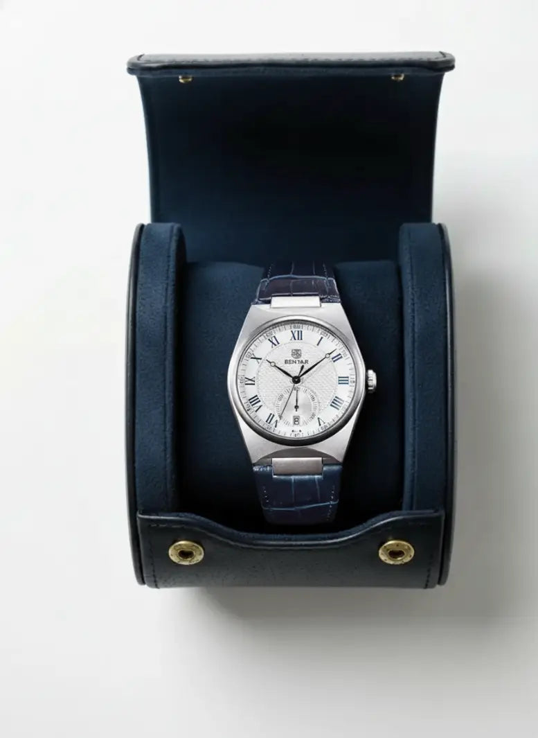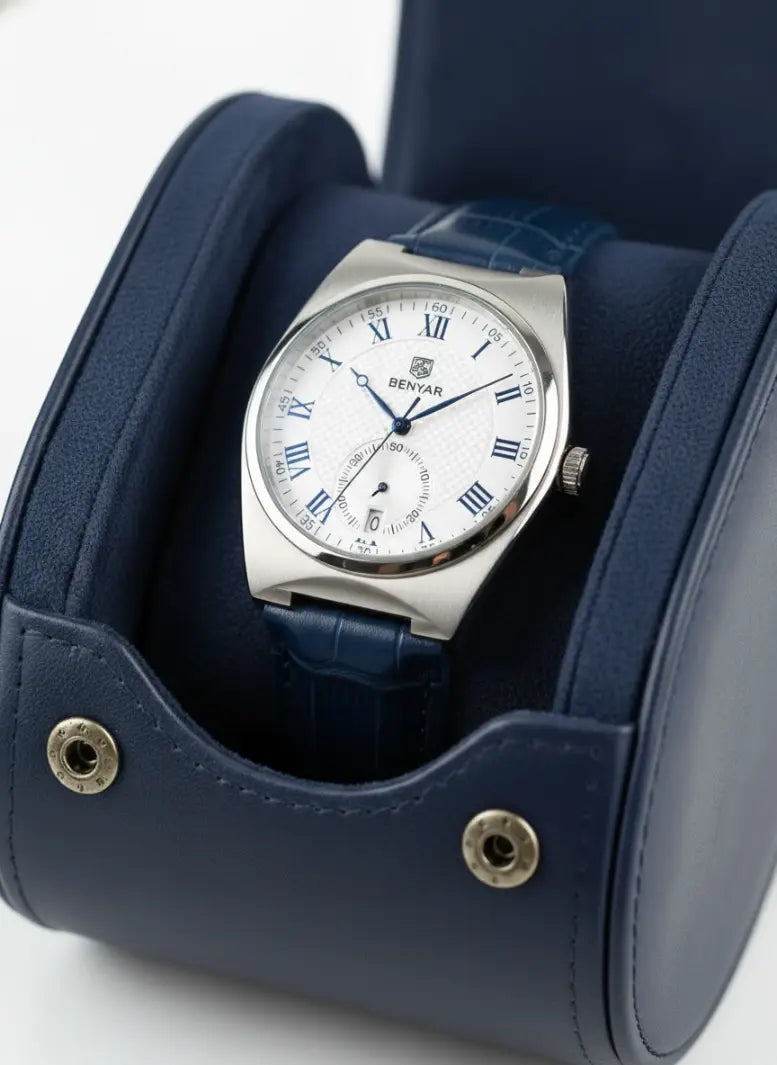 O Cavallero é a expressão da elegância moderna em um design que combina presença e precisão. Seu mostrador texturizado com algarismos romanos e subdial funcional de segundos reforça o equilíbrio entre estilo clássico e tecnologia contemporânea. Disponível nas versões azul e preta, ele traz pulseira em couro de acabamento premium e caixa metálica que garante robustez sem abrir mão do conforto no pulso.